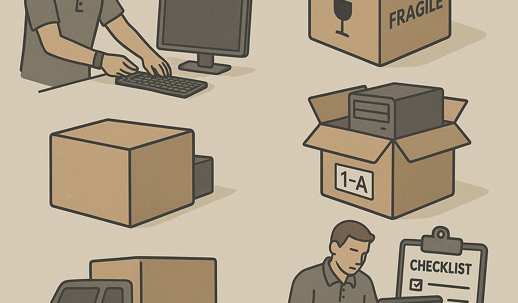 Mærkning er der, hvor mange flytninger vinder eller taber tid. Målet er, at hver workstation kan genskabes uden gætterier. Brug et enkelt system: medarbejdernavn eller asset-ID, nyt bordnummer, og en kasse- eller enhedsreference. Skriv tydeligt og brug labels, der bliver siddende under transport.