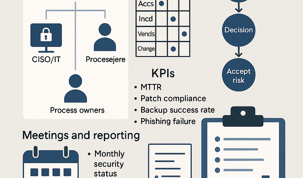 - KPI-dashboard: patch compliance, backup success rate, phishing failure rate, leverandørstatus